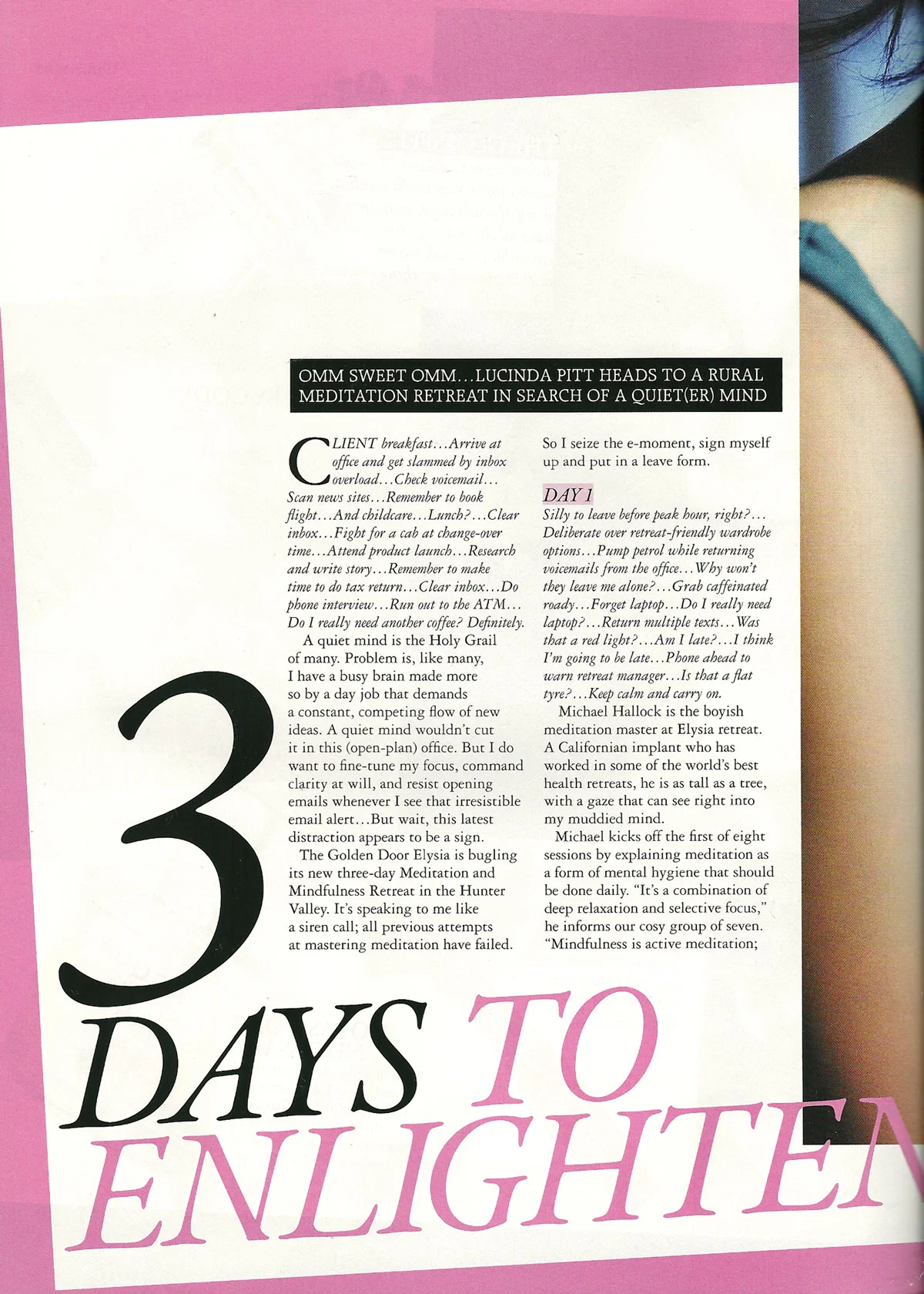 “Later that morning, my classmates report revelations… Mary announces that last night she enjoyed the best sleep ever - without the need for her usual pharmaceutical support crew. David reveals he’s never felt so free and is considering running off to an ashram… Michael just listens and smiles his mindful smile...